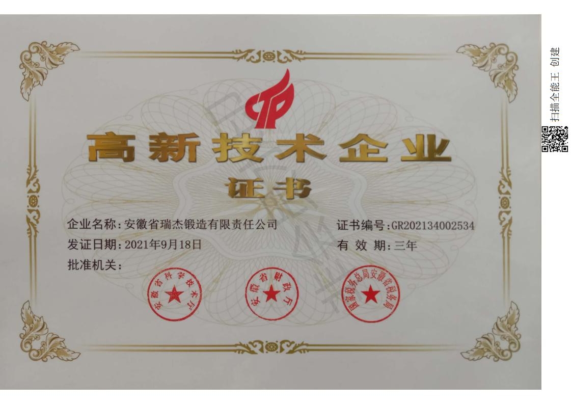 安徽省瑞杰鍛造有限責任公司始建于2004年,坐落于合肥市雙鳳工業區金淮路2號,是一家集研發、鍛造、熱處理、機加工、理化檢驗、表面處理及包裝運輸于一體的國家級高新技術企業和安徽省專精特新企業。公司注冊資金1000萬元,占地面積5441㎡。本公司主要生產自由鍛件、胎膜鍛件,常年為軍工、國營、民營等大中型企業配套,產品廣泛應用于冶金、礦山機械、風電、核電、小太陽、航空航天、化工、石...